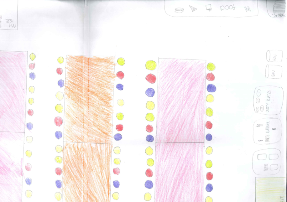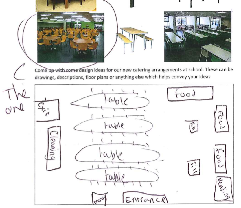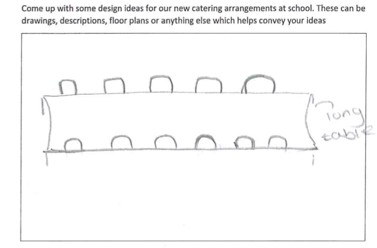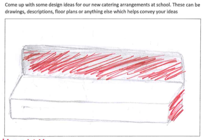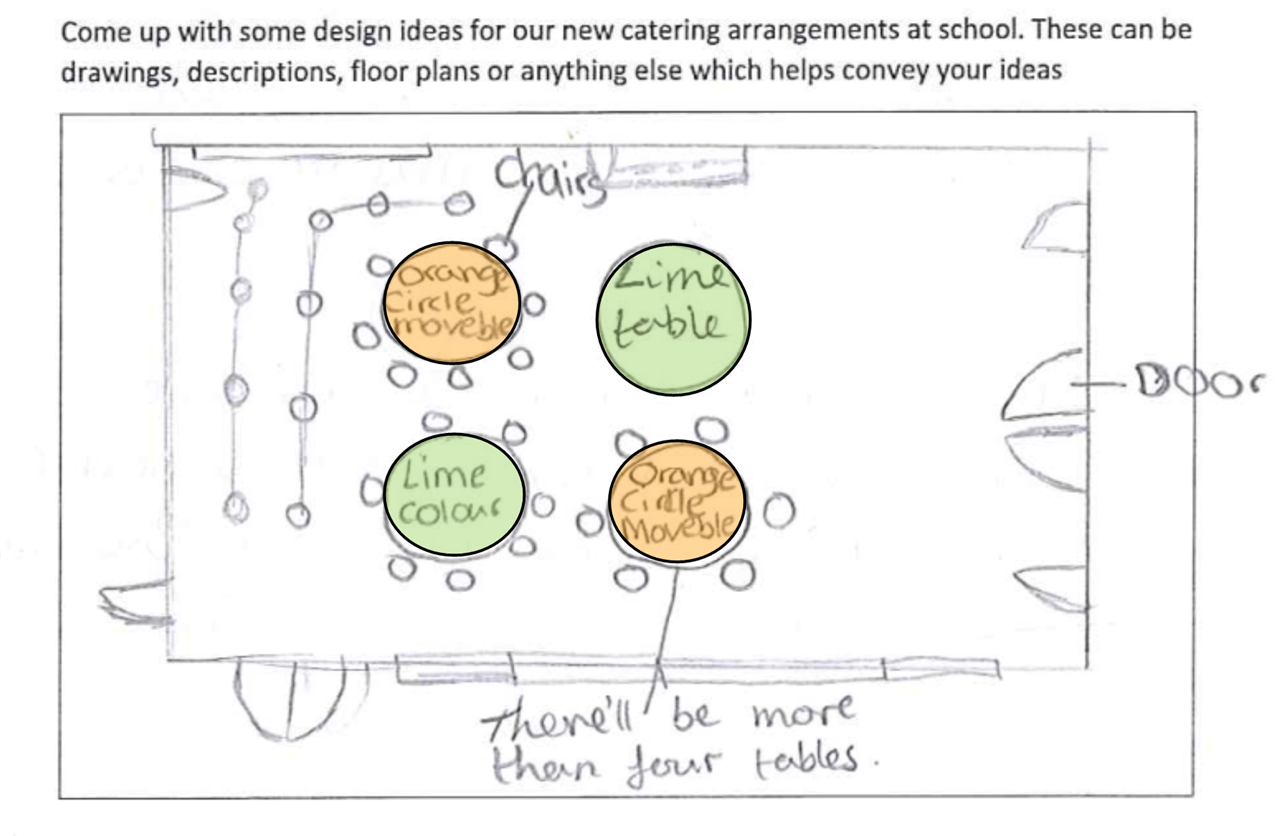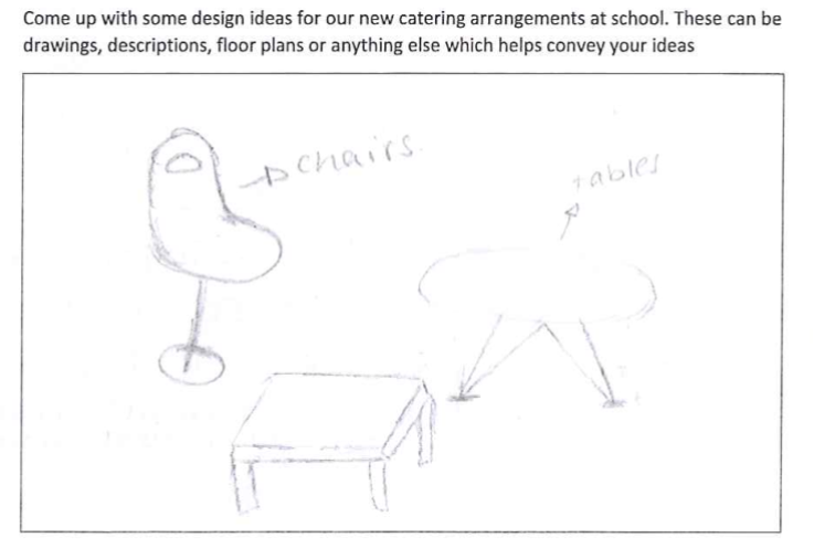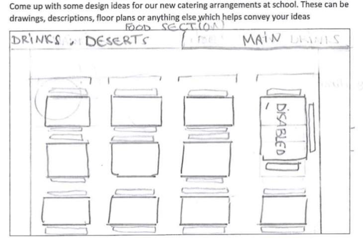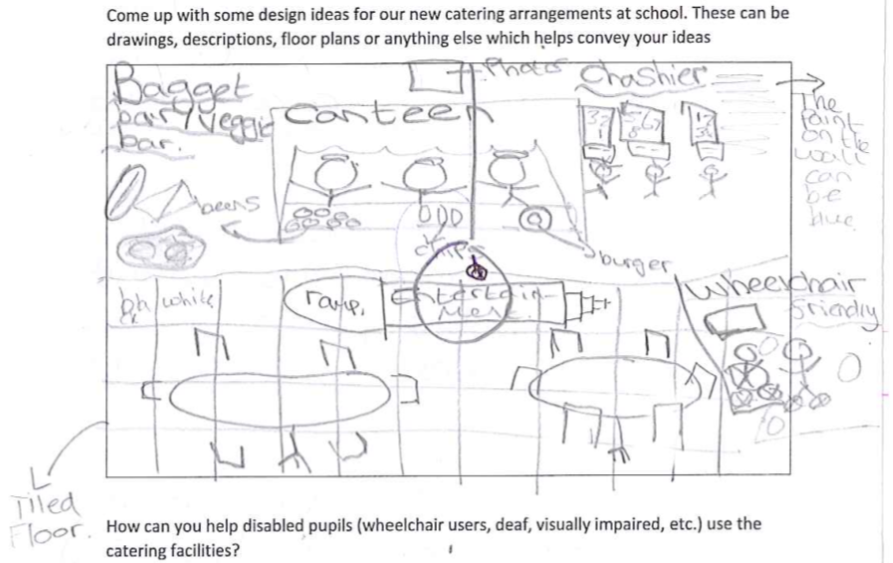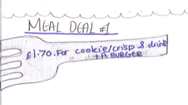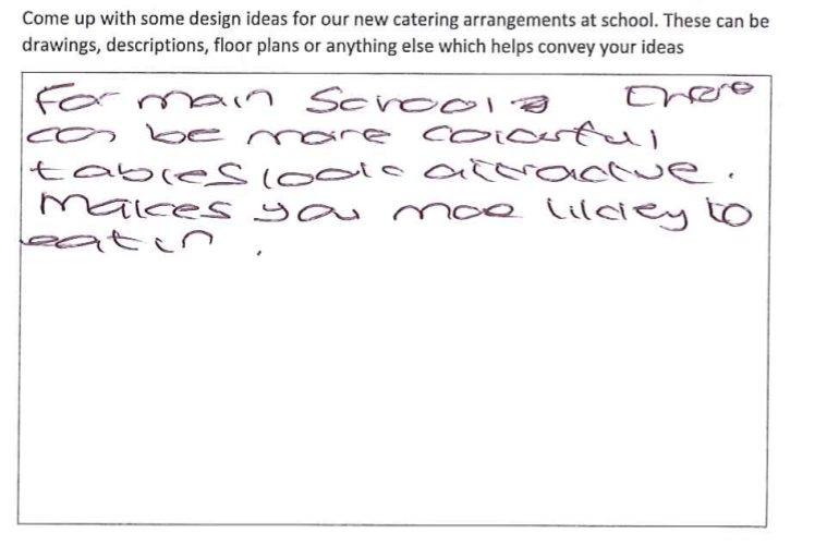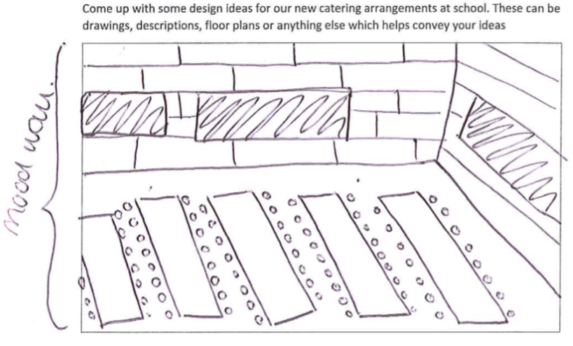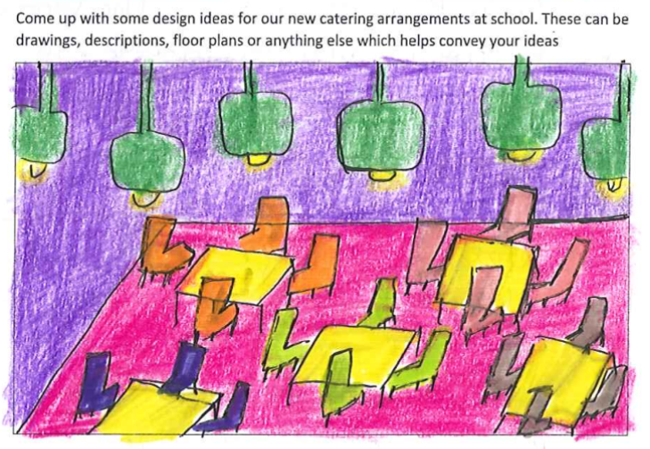 We've taken some of your ideas and tweaked the colours or the layout to see how pencil drawings might work in colour or how sketches could begin to be worked up into commercial ideas. None of these are finished items - together they form a 'mood board' we can share with potential caterers to get them thinking about what our pupils want.