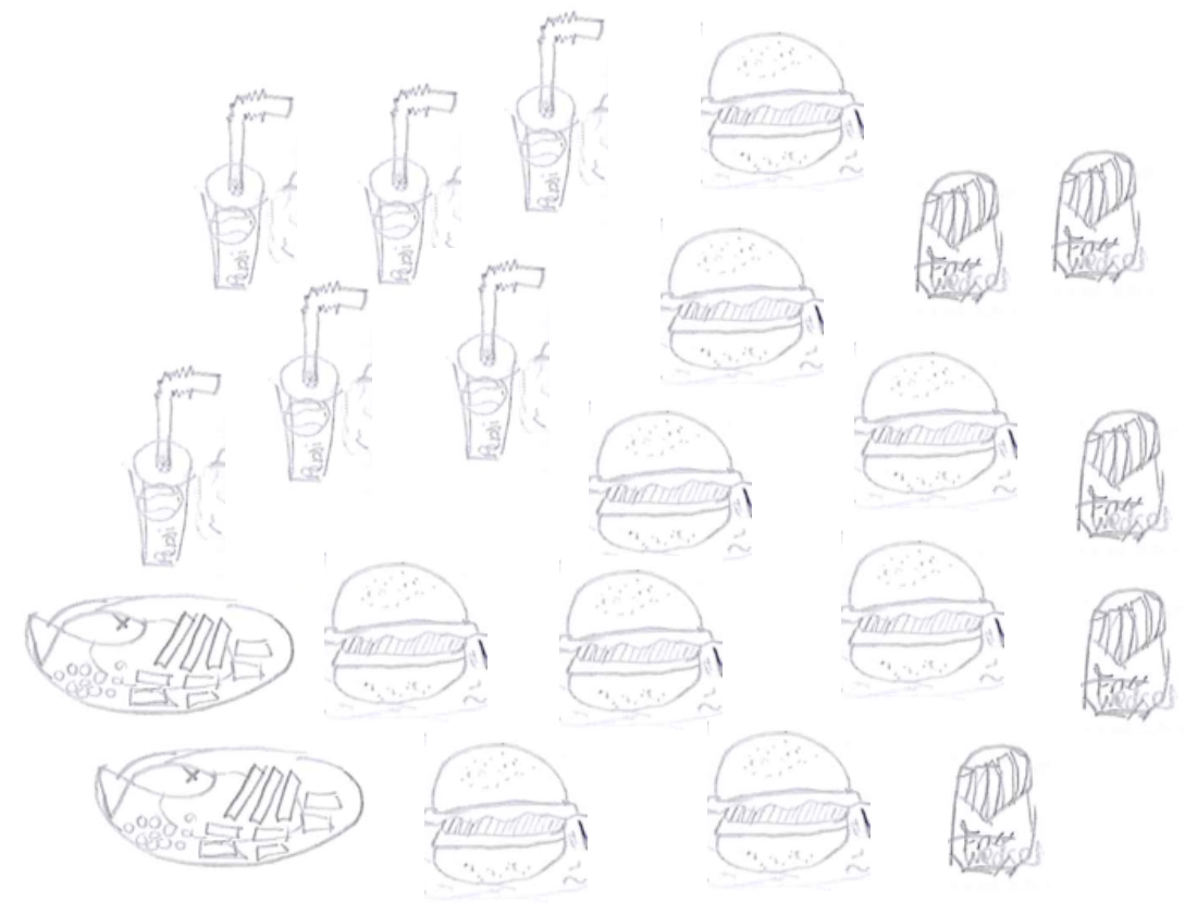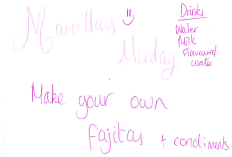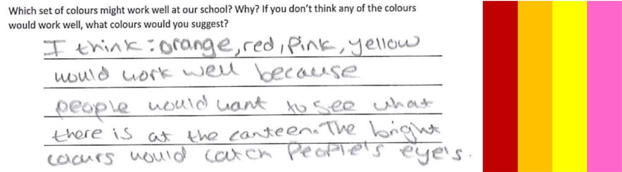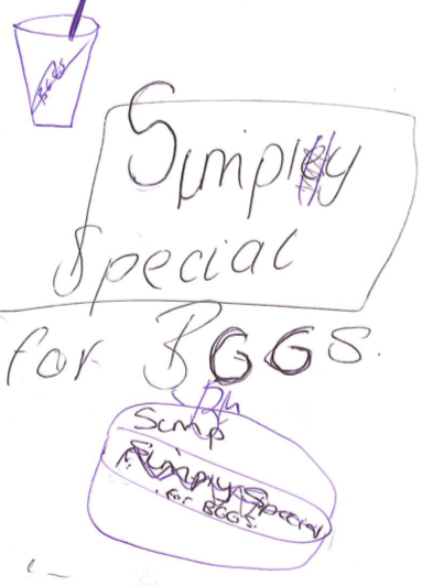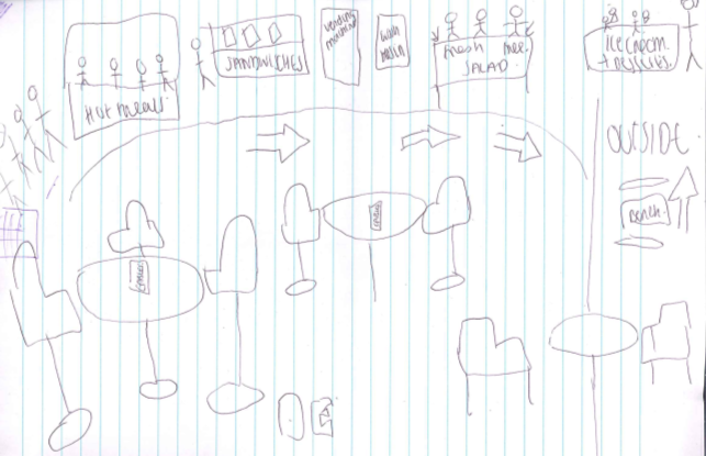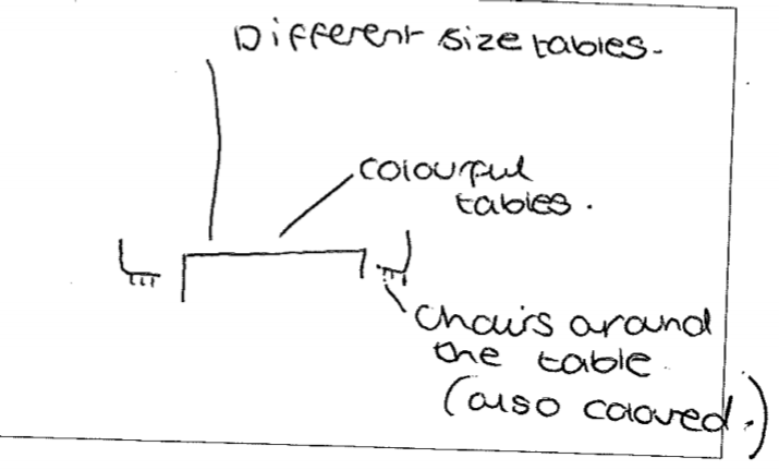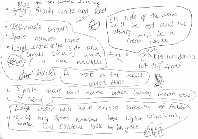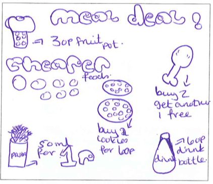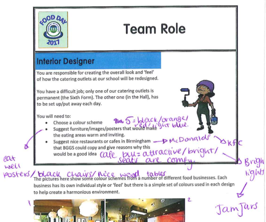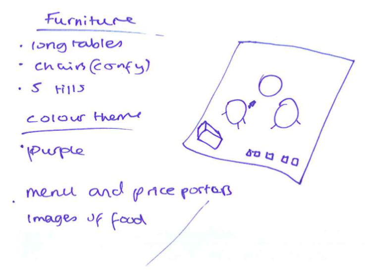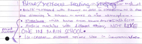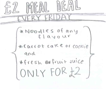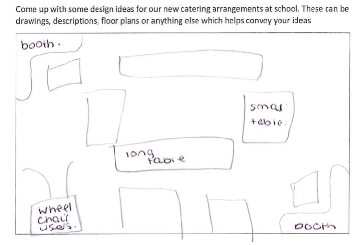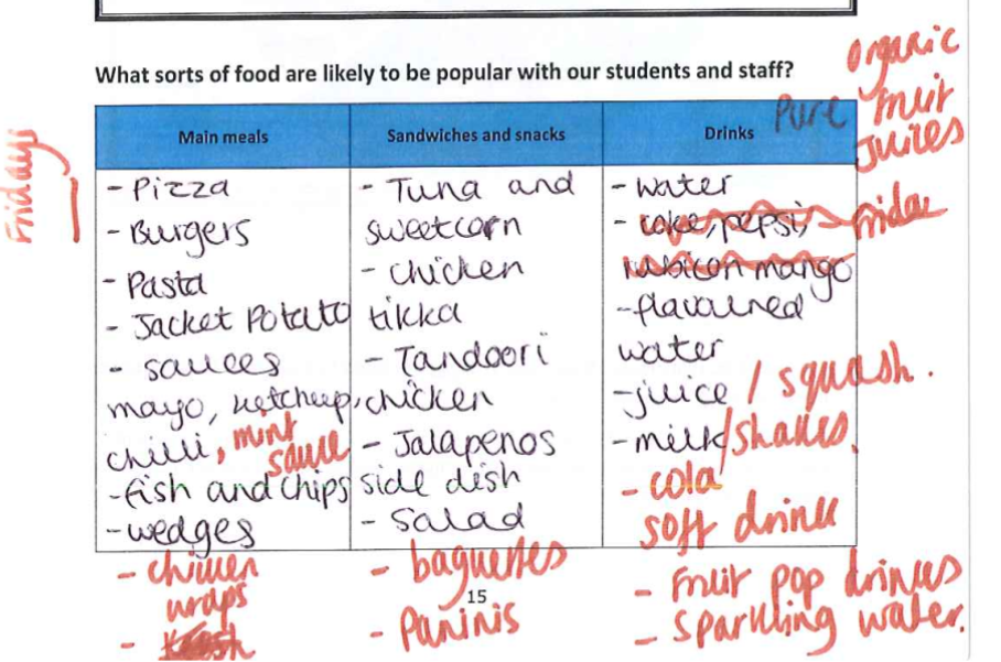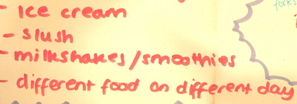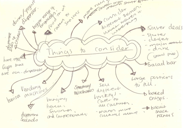 We've taken some of your ideas and tweaked the colours or the layout to see how pencil drawings might work in colour or how sketches could begin to be worked up into commercial ideas. None of these are finished items - together they form a 'mood board' we can share with potential caterers to get them thinking about what our pupils want.