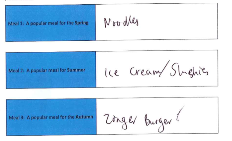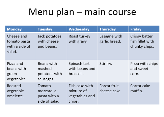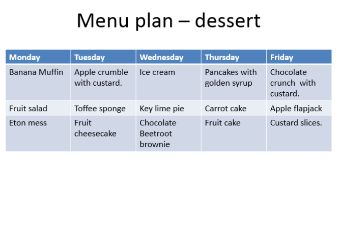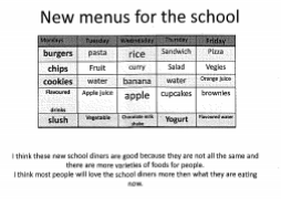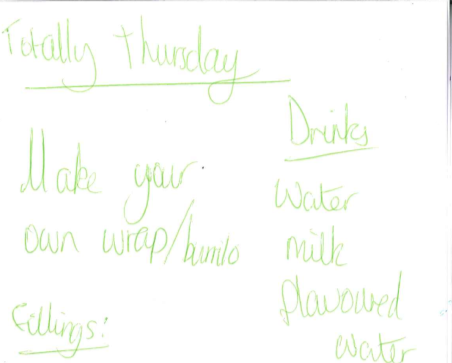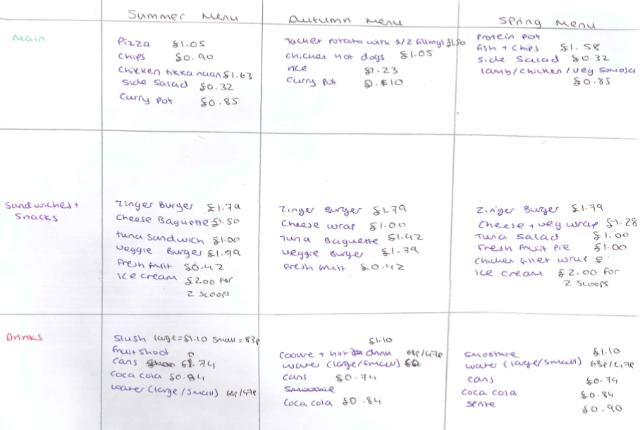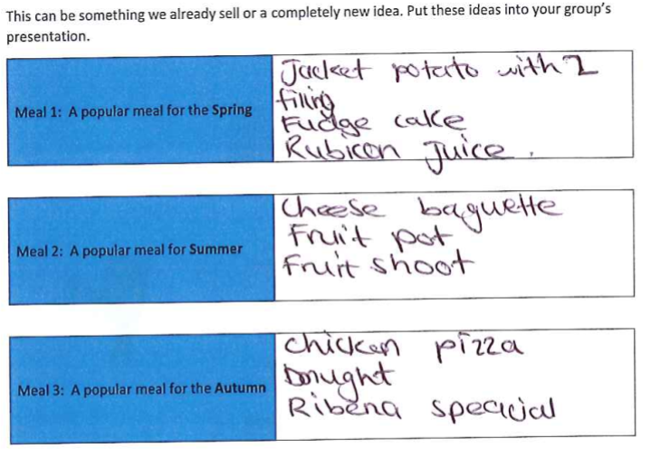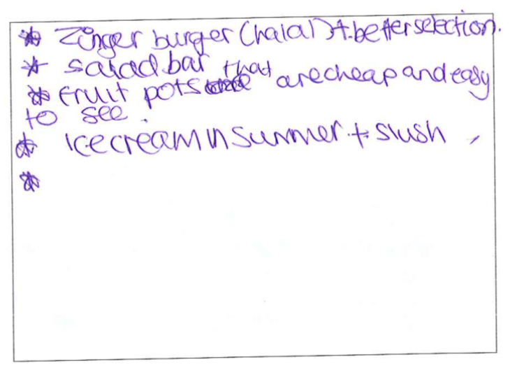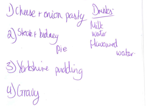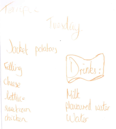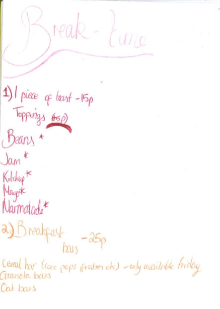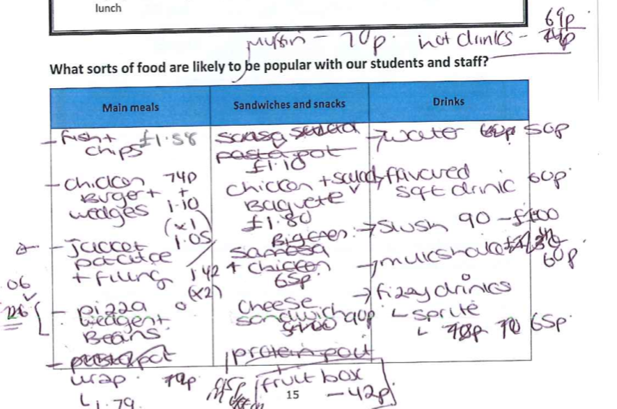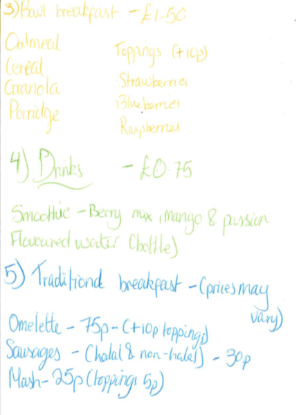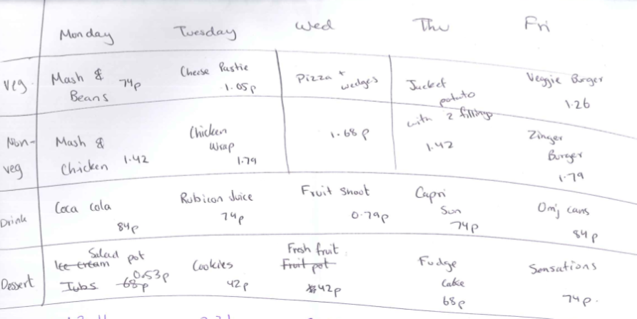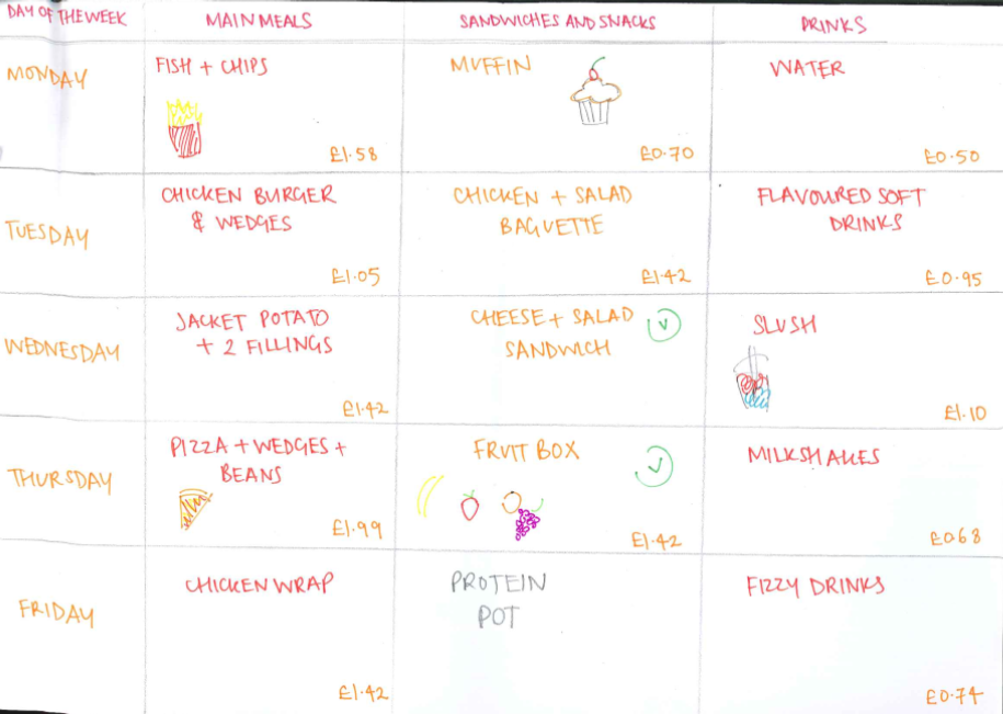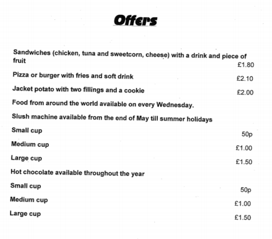 As you look at these, remember that we are trying to improve the food on offer so that all our pupils a) choose to eat in school during the day and b) spend more per person so we can keep the overall price of food low.