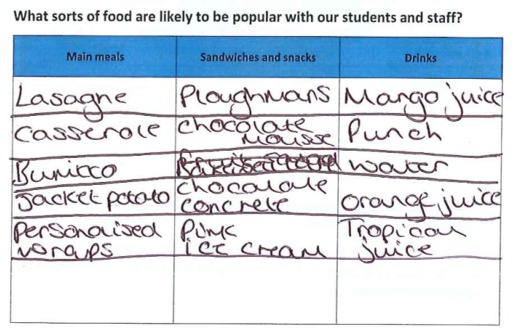 Finally, we aske you to suggest types of food which would appeal to your fellow pupils - and you responded with sample menus, recipes and ideas for meals which you think would work well here at BGGS.